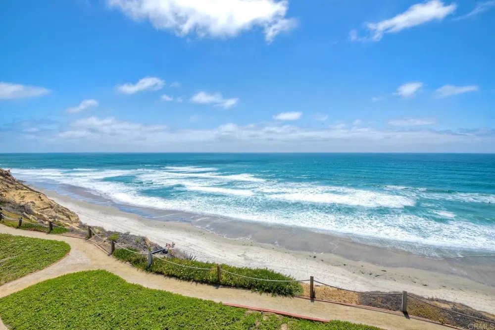 Ocean View Top Floor Unit at Seascape Sur! This rarely available unit is ready for you to move in! Enjoy endless ocean and sunset views from your Living Room, Dining Room, Kitchen and Patio. This bright unit offers 2 bedrooms, 2.5 bathrooms, updated kitchen with S/S appliances and granite countertops. Vaulted ceilings in Living Room, Dining Room and both Bedrooms. Fresh paint throughout, New carpeting, Plantation Shutters on all non-view windows and beachy wood paneling in both bedrooms. Skylights let in natural light and fresh sea air. Primary bedroom overlooks the complex's lush landscaping and pool, has attached en-suite bathroom, sitting area, and office or "Zoom Room" attached, as well as a large walk in closet. Secondary bedroom is a generous size and has a large closet. Full size, side by side laundry is in the hall closet, and there is a large storage closet in the main entry way. The unit comes with 2 side by side assigned underground parking spots and storage closets at the end of each space. Seascape Sur is a lush, Hawaii-like setting right on the bluffs of Solana Beach. You will feel like you're on vacation as soon as you enter the gates. Enjoy walking paths through the complex with ponds and streams filled with Koi, Turtles, Ducks and other wildlife. HOA amenities include Pools, Spas, Full Size Tennis Courts, Walking Paths, Clubhouse, and more. Basic Cable is also included. A short walk to the steps leading to the beach, and shops on the 101 and the famous design district on Cedros.