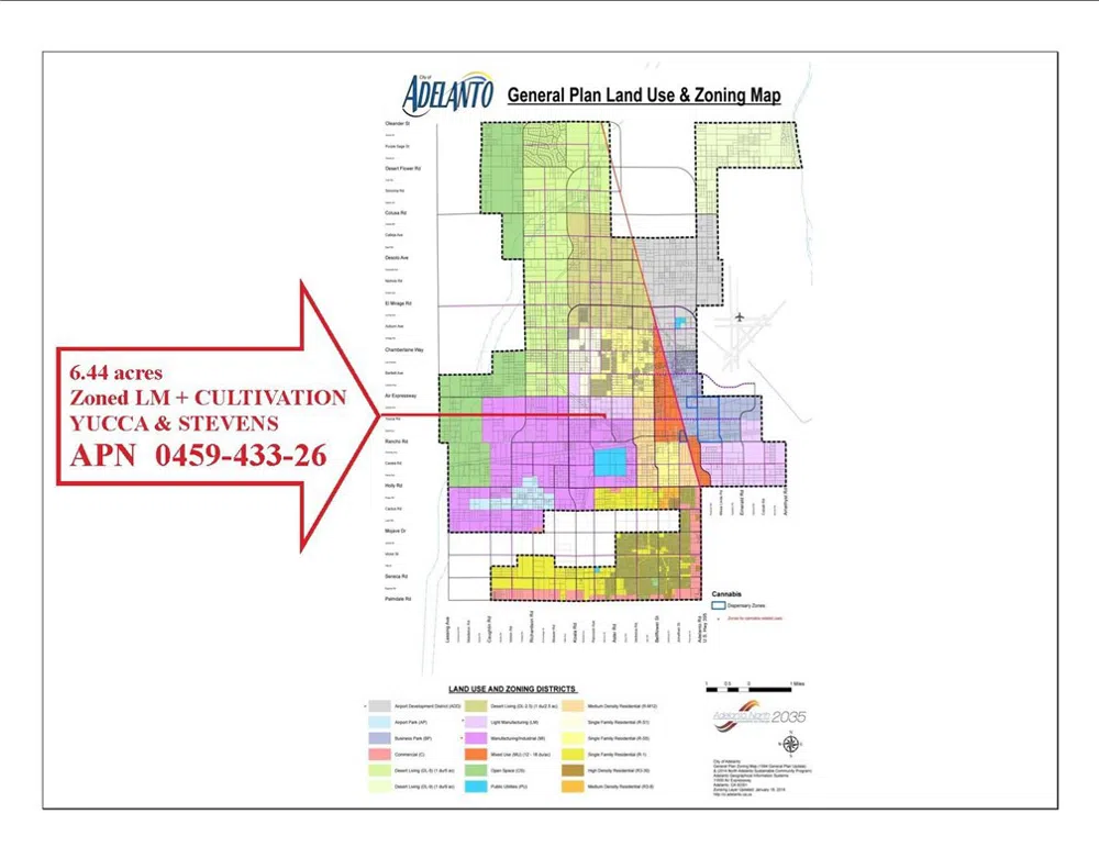 Major Price Adjustment. Property now sold as Raw Land - seller will NOT complete the Conditional Use Permit or Entitlements. Prime DEVELOPMENT Project. Located just east of the 420 Warehouses on Yucca. Only 840 feet away from pavement AND utilities on Yucca Rd. See PROPOSED Site Plan attached that provides for FIVE (5) Warehouses - build all and operate yourself, or rent out, or build in phases. Great Value for the size and location - UNDER $20,000 / acre for INDUSTRIAL land located NEAR pavement AND utilities. NOW, priced to for quick escrow! Zoning MI allows Heavy Manufacturing, Industrial and Cannabis. Check with City for other possible uses.